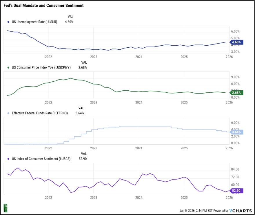 The “K-Shaped Economy”, a term coined by Peter Atwood (an economist, author, and William & Mary professor), attempts to describe the stark differences in perspective between individuals in higher-income brackets and those in middle- and lower-income groups. In general, individuals who are homeowners and investors have benefited from advancing markets and rising home prices in recent years. As for low-to-middle-income individuals, they are disproportionately impacted by the effects of higher inflation and lower affordability. Unemployment has risen (especially among recent college graduates), inflation remains above target, and they have not benefited from the rise in asset prices because they have far less exposure to stocks and real estate. This phenomenon, which incorporates the softening job market and higher inflation mentioned previously, may be part of the reason consumer sentiment remained at washed-out levels throughout 2025.[13]