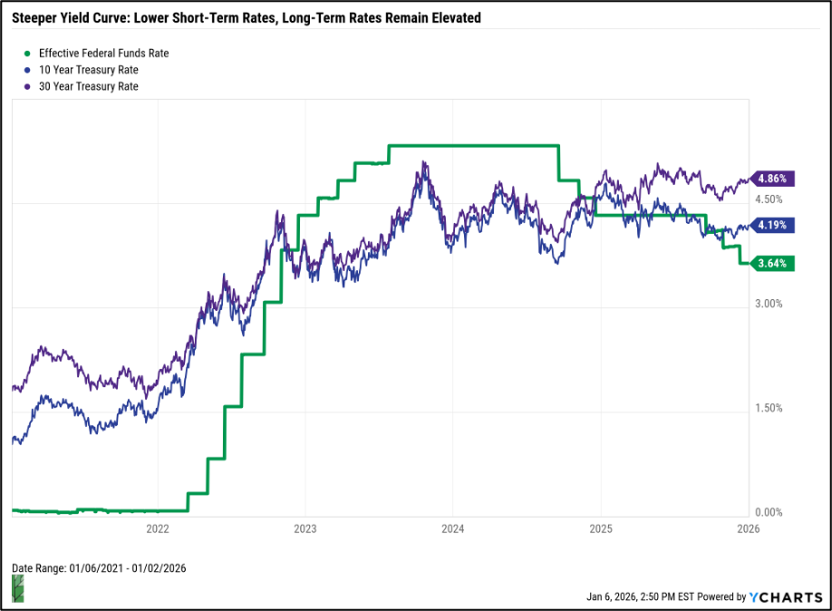 To complicate matters further, Jerome Powell’s term as Fed Chairman ends in May, and President Trump is expected to announce a new Chair that may be more willing to pursue rate cuts more aggressively (although the Chair still represents just one vote out of 12 voting members of the Committee). This may boost financial assets and economic growth; however, it may also spur another round of painfully high inflation, which harms consumers in the long run. For bond markets, the outcome may be a continuing steepening of the yield curve (i.e., lower short-term rates, long-term rates remaining elevated or moving higher), as we saw in 2025.